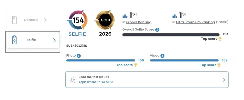 DxOMark verilerine göre Aralık 2025’te en iyi selfie performansına sahip akıllı telefon iPhone 17 Pro oldu. Model, yapılan testlerden ortalama 154 puan alarak listenin zirvesine yerleşti. İkinci sırada ise 151 puanla iPhone 16 Pro Max ve Honor Magic 6 Pro bulunuyor.